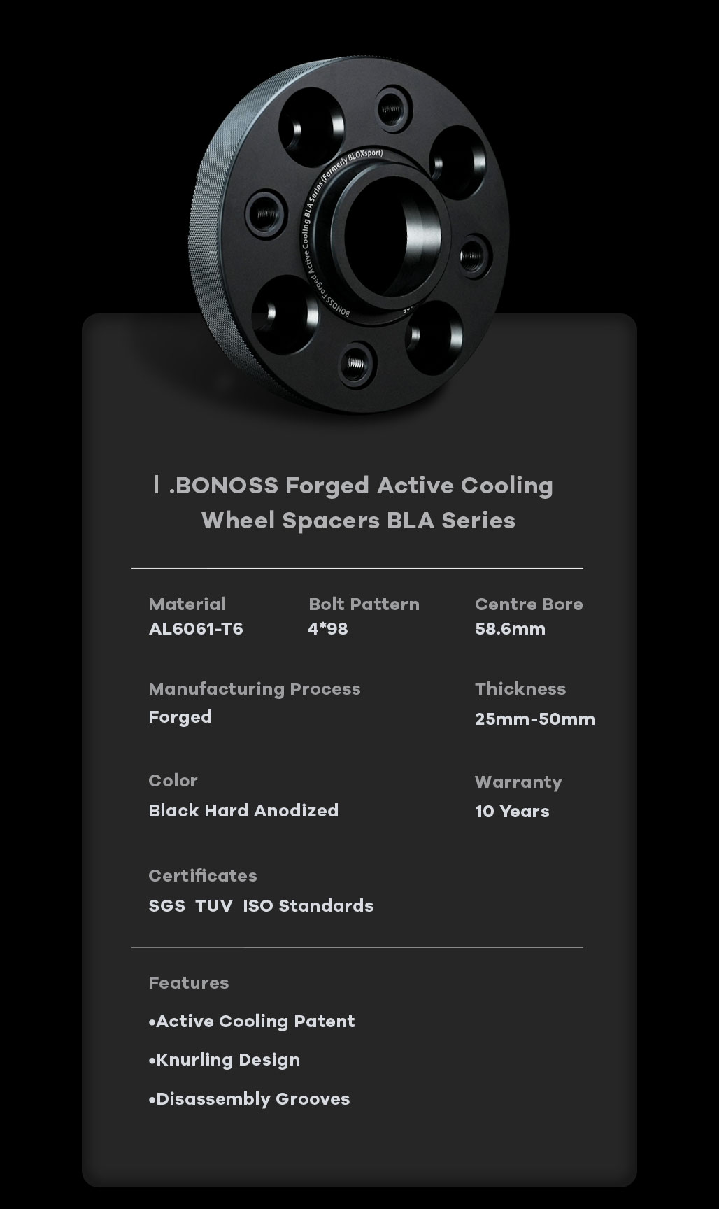 Generally, wheel spacers are made of steel or aluminum. They are just the automobile accessories installed between the assembly hub and wheel. As long as you use high-quality Lada Granta wheel spacers and install them properly, they are safe. Take the Lada Granta 4×98 wheel spacers as an example, we use forged AL6061-T6 material (tensile strength ≥310Mpa), modern CNC machining by 0.02mm tolerance. All of our products have got more than 50 SGS TUV authoritative test reports. Compared with those cheap casting wheel spacers, BONOSS forged active cooling wheel spacers are safer, have higher performance, and are more professional in design. We believe more professional production offers more value for customers. For details, please check Are Wheel Spacers Good or Bad.